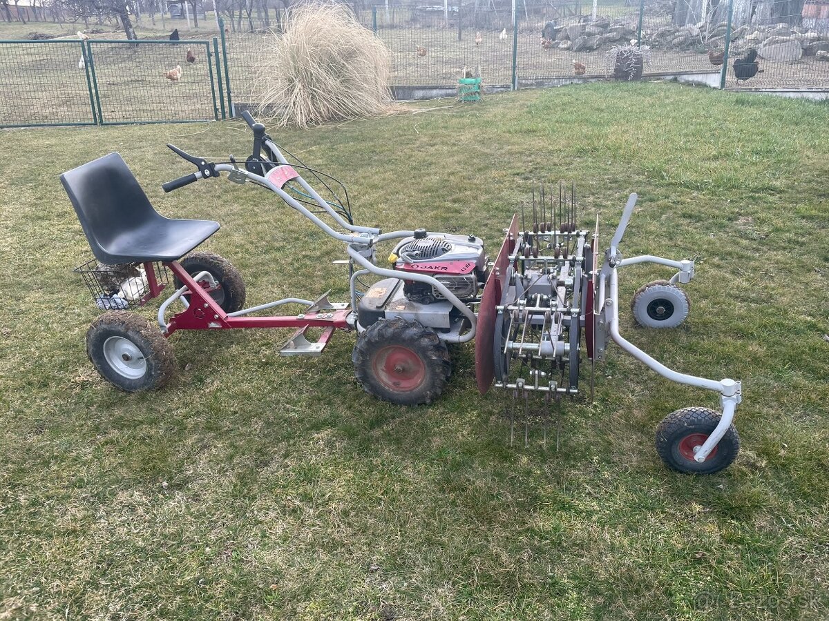 Predám plne funkčnú kosačku, hrabačku a vozík. Všetko funkčné, bez chýb. Pohonná jednotka má hydrostatický pohon vpred aj vzad, plynule nastaviteľná rýchlosť. Pripravená na sezónu, čerstvo vymenený olej, filtre a pridám náhradné remene. Pohonná jednotka má nezničiteľný motor Briggs & Stratton s výkonom 6,5HP. Vhodná na kosenie vysokej trávy, zvládne aj veľké výmery. Používaná 5 rokov v sade 10 árov. Pôvodná cena 3700€. Predávam iba všetko spolu. Dohoda možná pri obhliadke.