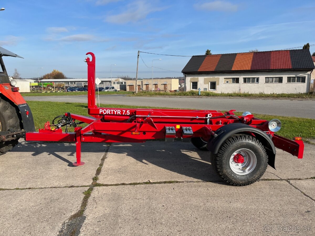 Traktorový nosič kontejnerů Portýr 12.9 - [11.2. 2026]Traktorový nosič kontejnerů Portýr 12.9, tandemová odpružená náprava ADR, celková hmotnost 12.000 kg, nosnost 9.200 kg, optimnální délka kontejneru 4,6 m, výška háku 1.000 mm, odpružené oje, dvouhadicové vzduchové brzdy, přímé napojení na traktor 3 hydr.okruhy, rychlost 40 km/hod.