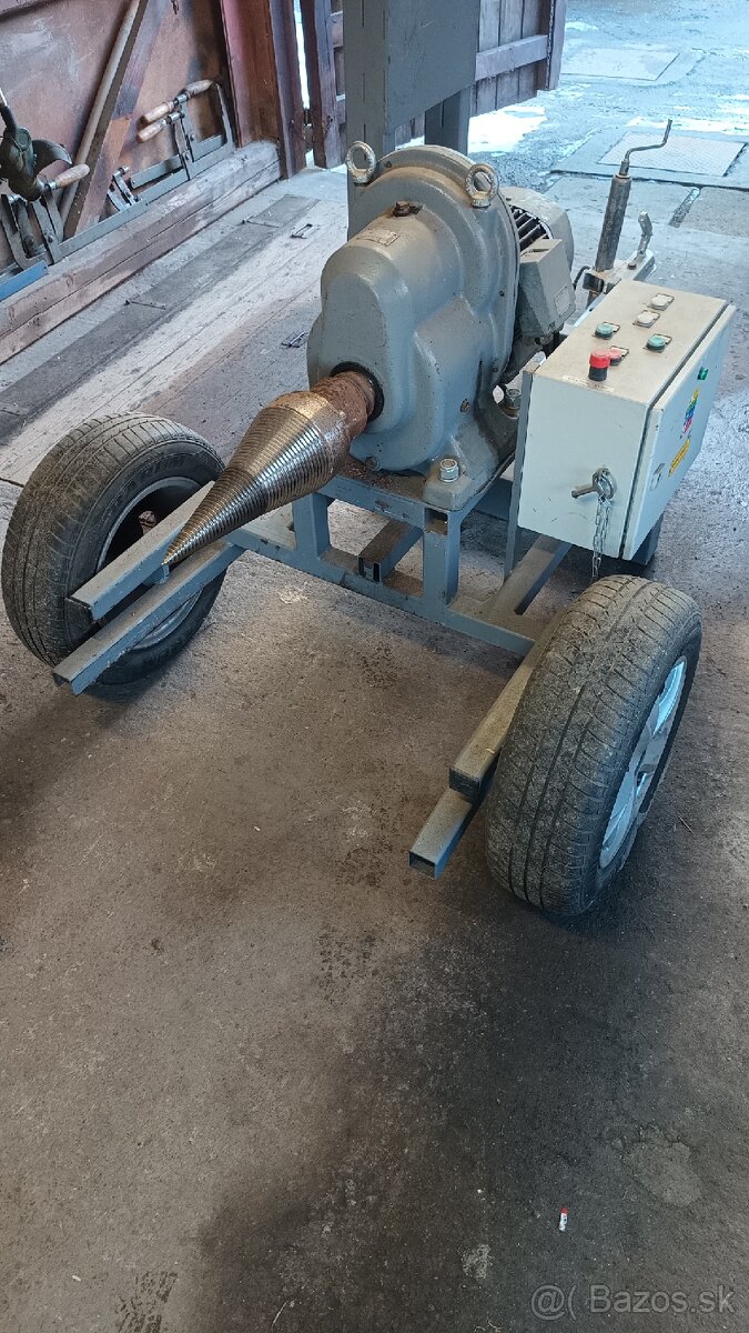 Predám málo používanú el.kálačku, na veljcy kolesách, výsuvné tiahlo so žehličkou na guľu. Motor 5,5kw 2910ot/ním MEZ Mohelnice, prevodovka Přerovské Strojírny, prevod 1:31,5. Výstupné otáčky +- 92 otáčok za minútu. Zapínanie je cez stykačové zapojenie hviezda - trojuholník ktoré ovláda časové relé na to určené. Ľavý aj pravý chod ( hviezda-trojuholník doľava -- hviezda-trojuholník doprava). Obsahuje aj motorový spúšťač, teda prúdovú ochranu motora. Kužeľ je dvojdielny, špička je kalená, dá sa oddeliť a vymeniť, dĺžka 300mm, priemer 140mm. Je k tomu aj stolík na malé klátiky ktorý sa nasunie do konštrukcie kálačky.