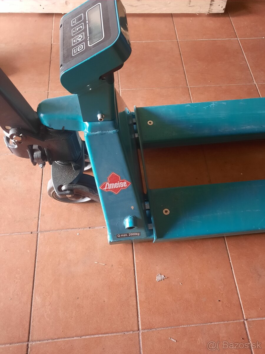 Predám paletový vozík Ameise® s váhou, nosnosť 2 000 kg, indikácia hmotnosti s prírastkom 1 kg, RAL 5018 tyrkysová modrá. Kupovaný 5/2019, málo používaný, len na ľahké veci (kartón).Nový stál 1189 €.