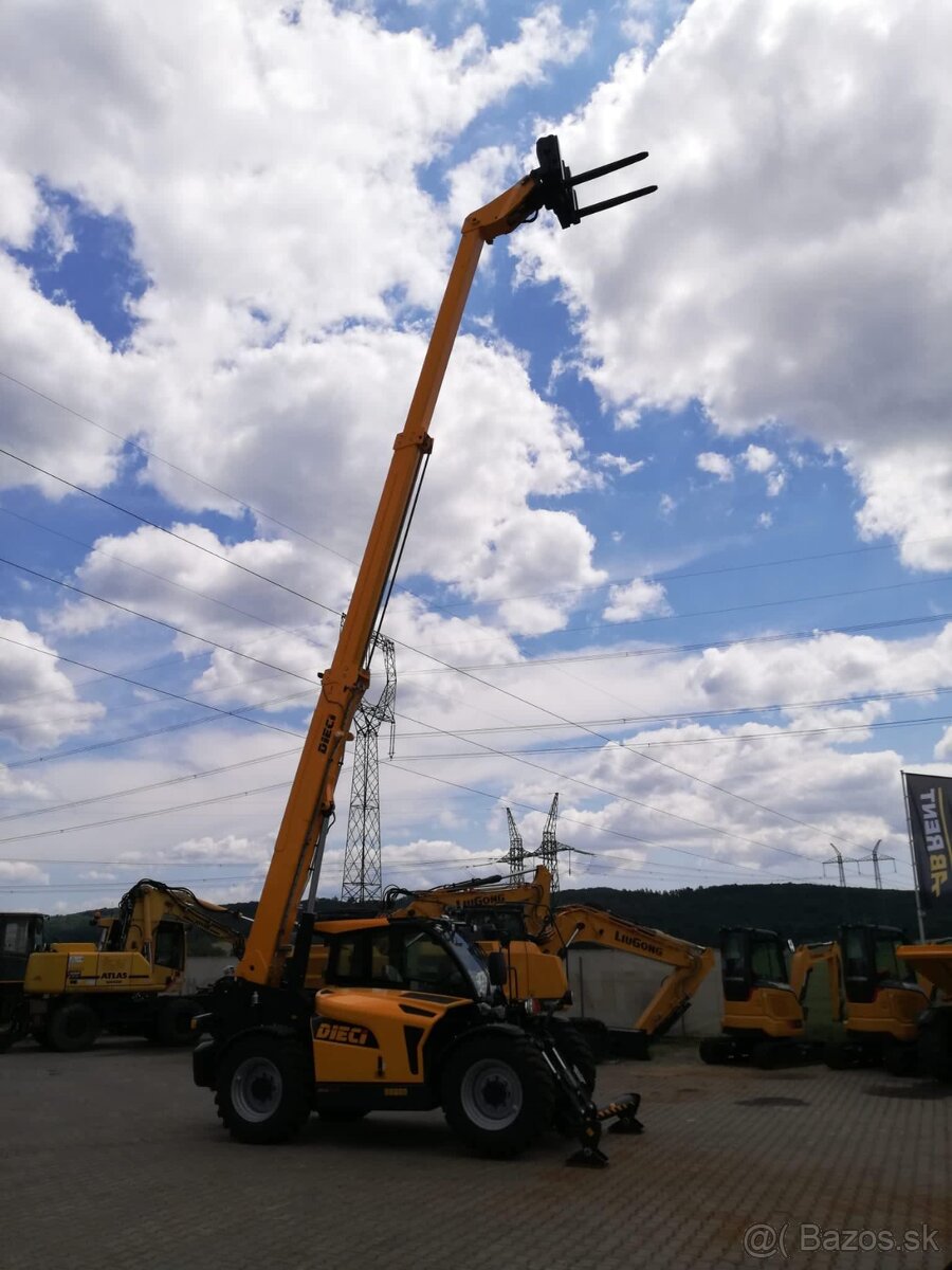 motor Kubota V3307-CR-TE5-HP Stage V, 54,6 kW, s DOC a DPF / hydrostatický pojezd / dvourychlostní převodovka / Inching pedál pojezdu / zubové čerpadlo pro ventilátor / pístové čerpadlo pro řízení i výložník / dvě říditelné nápravy s epicykloidálními reduktory / způsob řízení - 4 kola, 2 kola nebo krabí chod / mokrá náprava vpřed / zadním s dvojitým (sekundárním) hydraulickým okruhem / negativní systém parkovací brzdy / 45% uzávědrka diferenciálu (LSD) / ROPS-FOPS kabina / Joystick 4v1 s funkcí flow-sharing / vzduchem odpružená sedačka / klimatizace / topení / zabezpečení stroje - imobilizér / DAB rádio s USB & Bluetooth s handsfree / indikace zatížení nákladu / tachometr / LCD display s provozními parametry / DPF indikátor vypalování / vyhřívaná externí zpětná zrcátka / bzučák zpátečky / Deadman pojistka v joysticku / přídavná 2 LED světla na výsuvné části výložníku / LED světlo na hlavě výložníku / 2 LED světla na předku kabiny + 2 LED světla vzad na kabině / odpružení výložníku / tažný čep pro přívěs pro až 15t přívěs / 7-pólová el. zásuvka pro přívěs / halogenové přední světlomety / standardní pneu CEAT MPT602 405/70-24 / blatníky / Upínání Dieci s přídavným okruhem / rozšířující adaptér s vidlemi 120x50x1200 mm / Lopata standard 1m3 s břitem