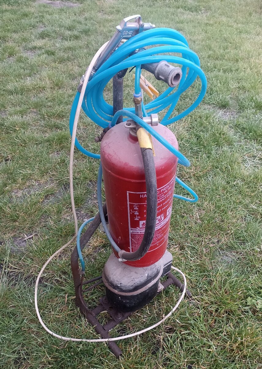 Kompresor vyrobený doma z chladničkového kompresoru a hasičského prístroja. Funguje dobre, ale niekde dobre netesní - funguje to ako poistný ventil. Nastavovanie tlaku, pištol, filter v cene.