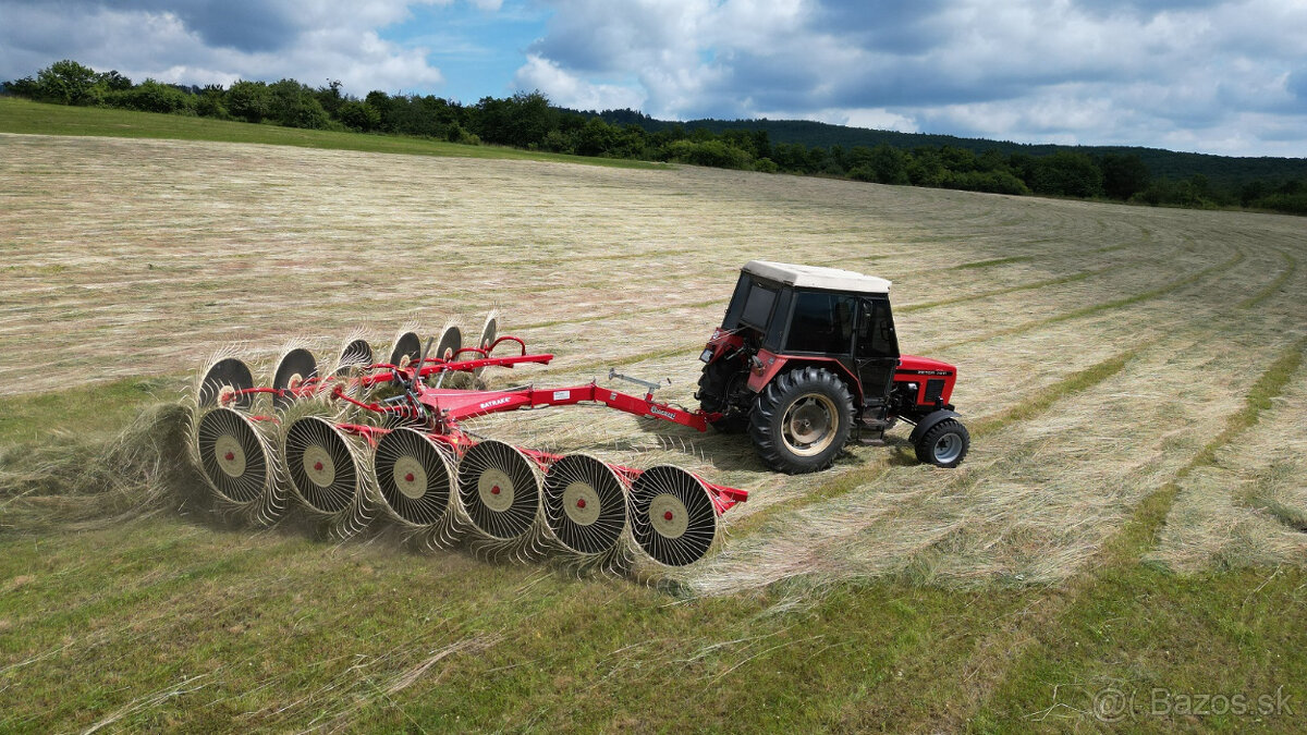 Táto hrabačka zhrňuje do stredu jediným prejazdom.Variabilný pracovný záber do 740 cm. Potrebný príkon traktora od 50 koní. Každé jedno koleso samostatne odpružené.
