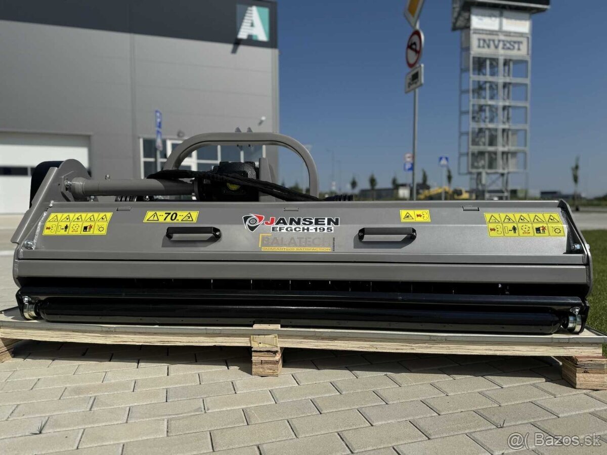 Kvalitný mulčovač Jansen EFGCH-195 určený za traktor na 3-bodový záves. Vhodný na mulčovanie trávy, buriny a náletových drevín na lúkach, poliach, v sadoch alebo pri údržbe pozemkov. Stroj má hydraulický bočný posuv a robustnú konštrukciu.