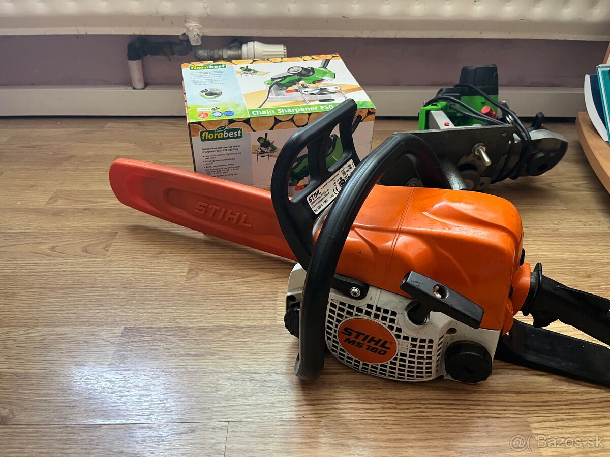 Predám komplet: motorová píla Stihl MS 180 + elektrická brúska na reťaze Florabest Chain Sharpener FSG 85 B1.